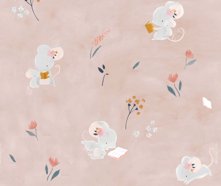 Tejido 100% algodón con diseño estampado de ratoncitos leyendo y flores sobre fondo crema. Ideal para coser ropa y complementos.
